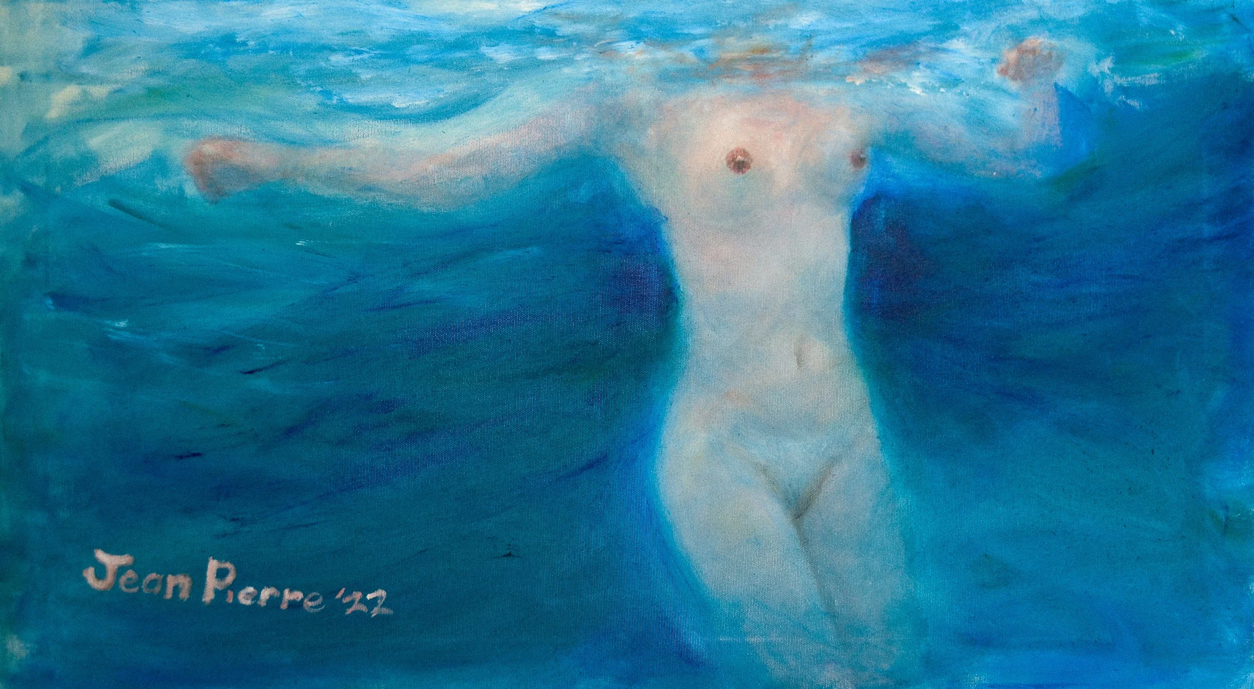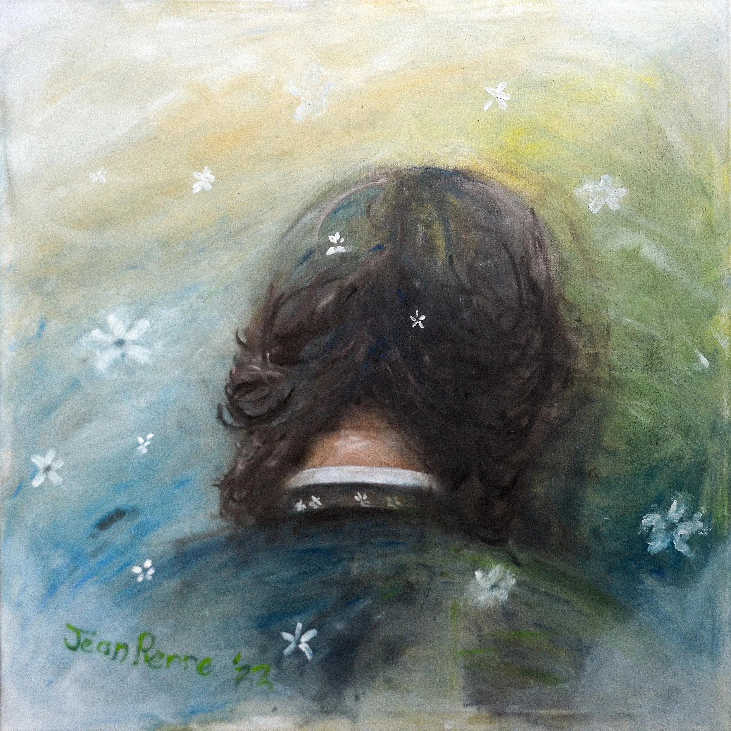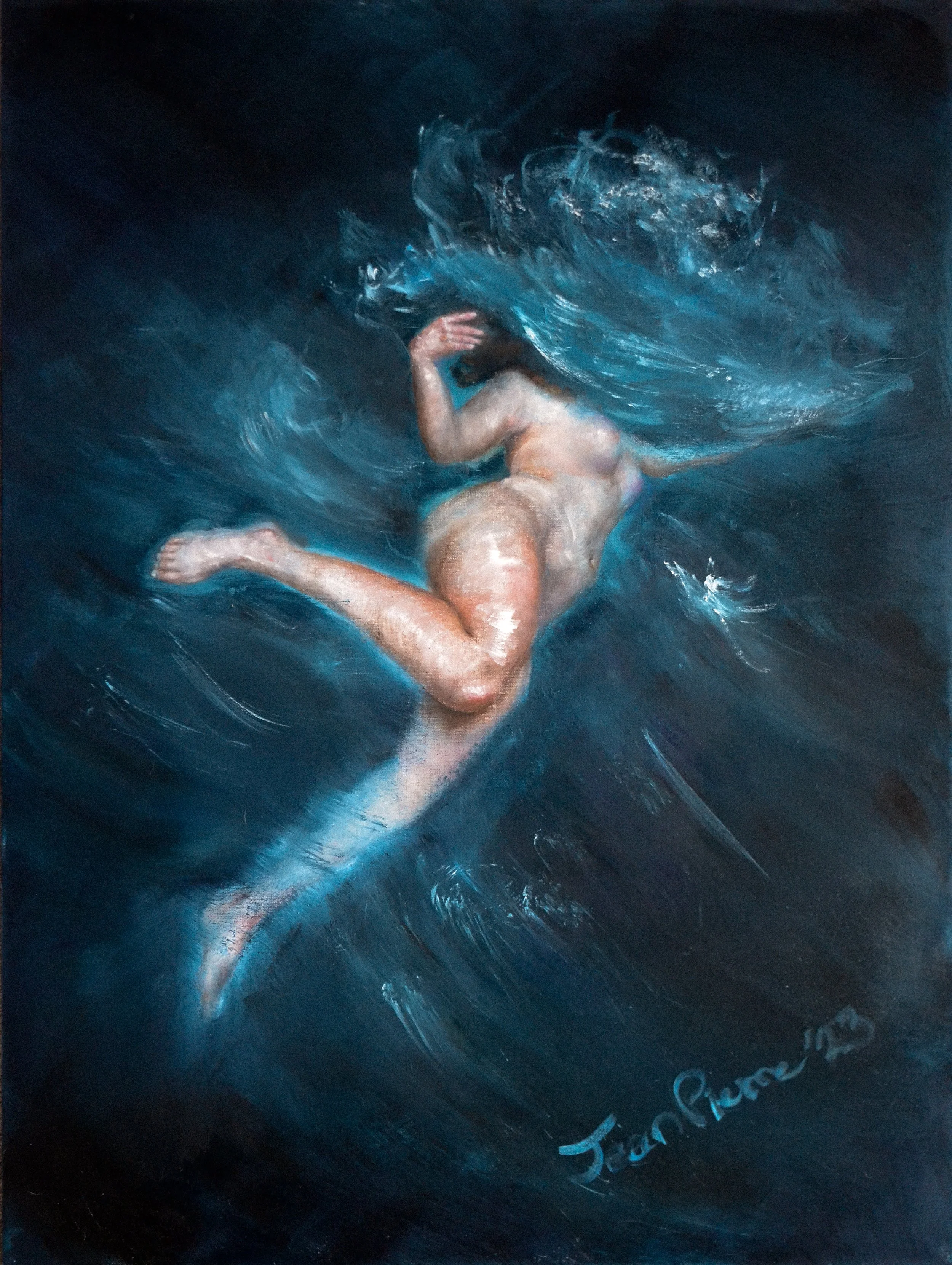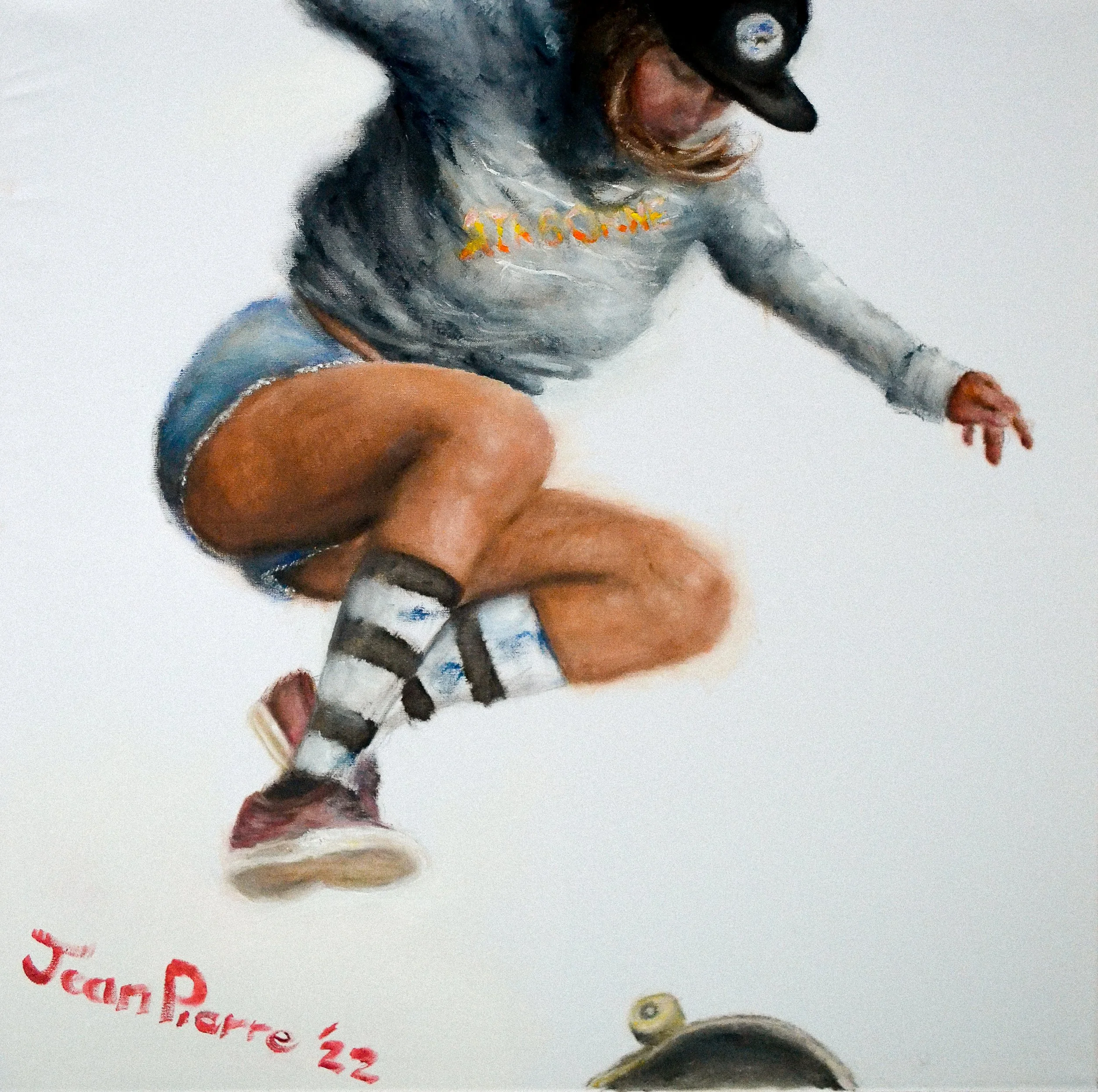 Jean Pierre's paintings take their inspiration from the work of photographers, geek culture, urban sports, and his own imagination. Although his work often has a dreamlike quality, his paintings often dwell on the very concrete beauty and potential of the human form. He is equally at home working with a muted and restricted palette, with deep shadows, the rich tones of skin, earth, and sea, or in bright, vivid colours; these last combine with moments of physical action and exuberance to give his series of paintings depicting skateboarders particular vibrance and joie de vivre.