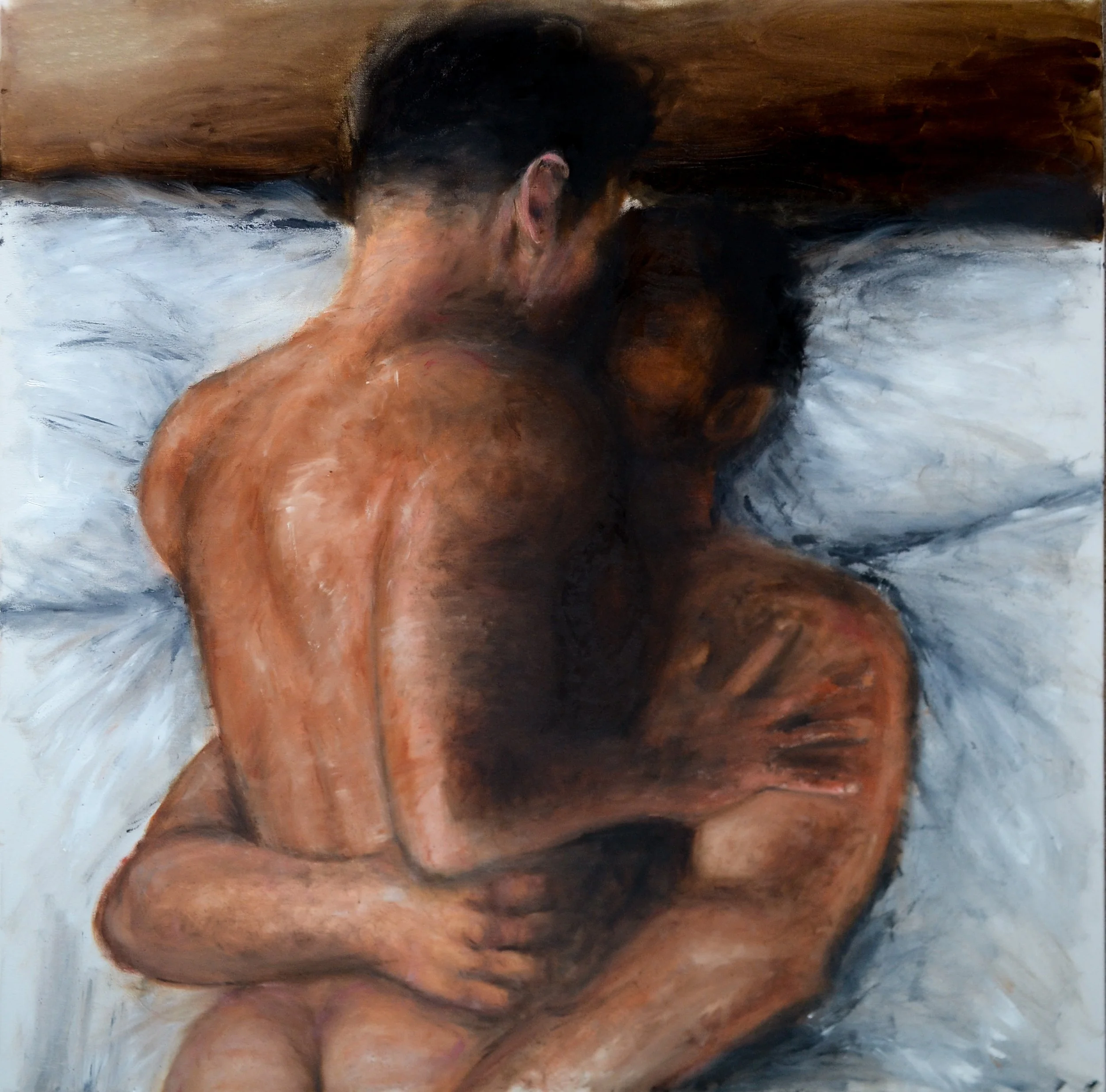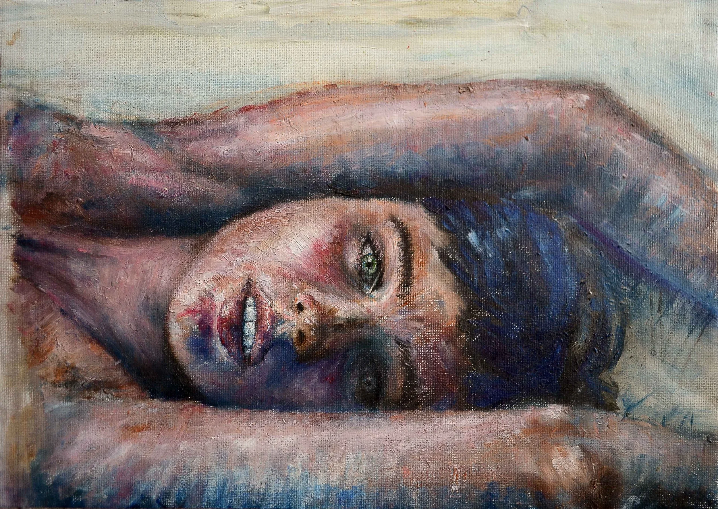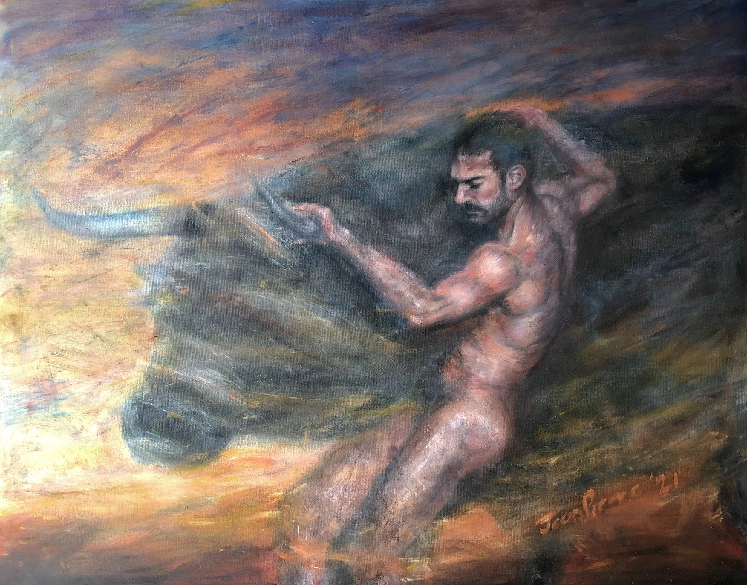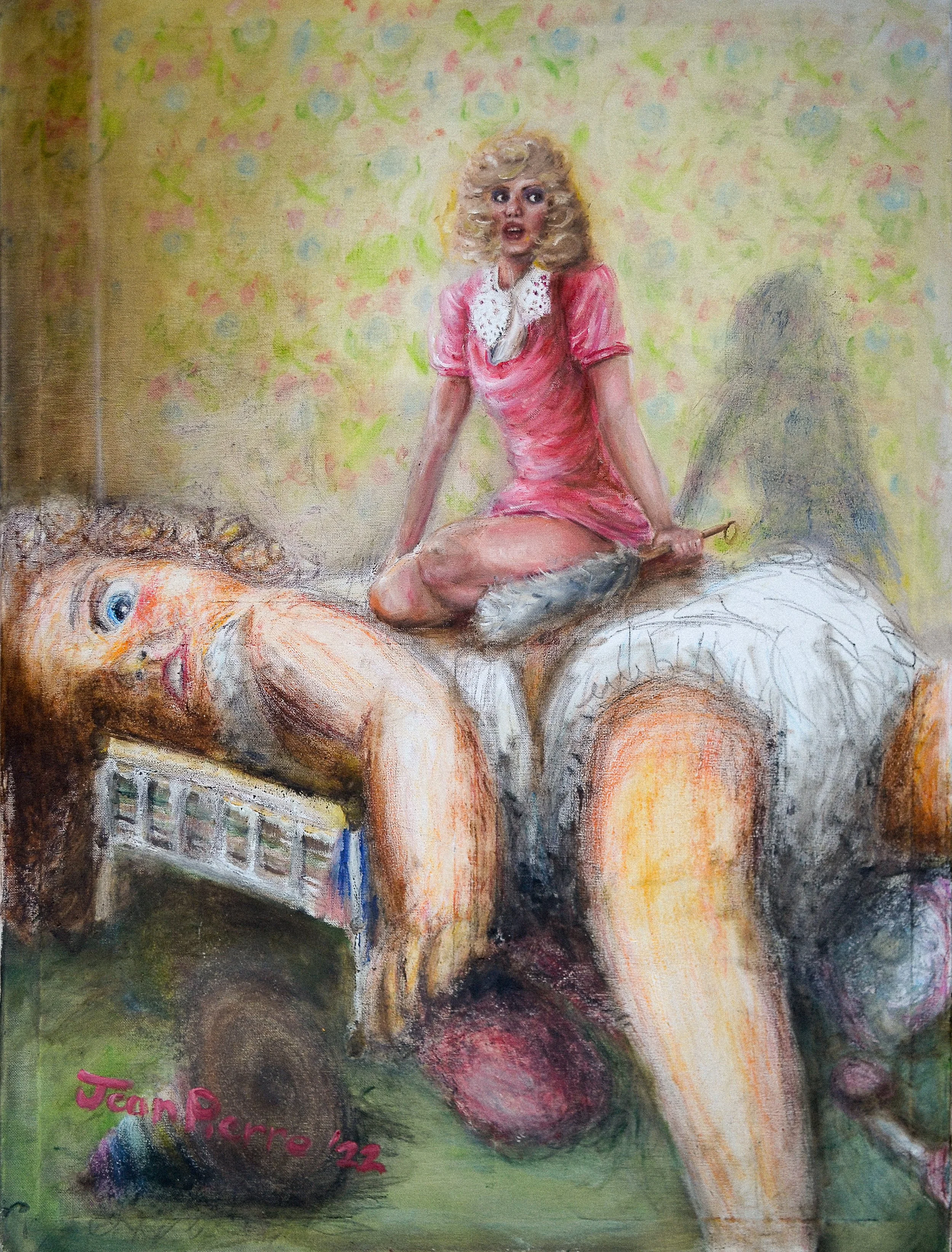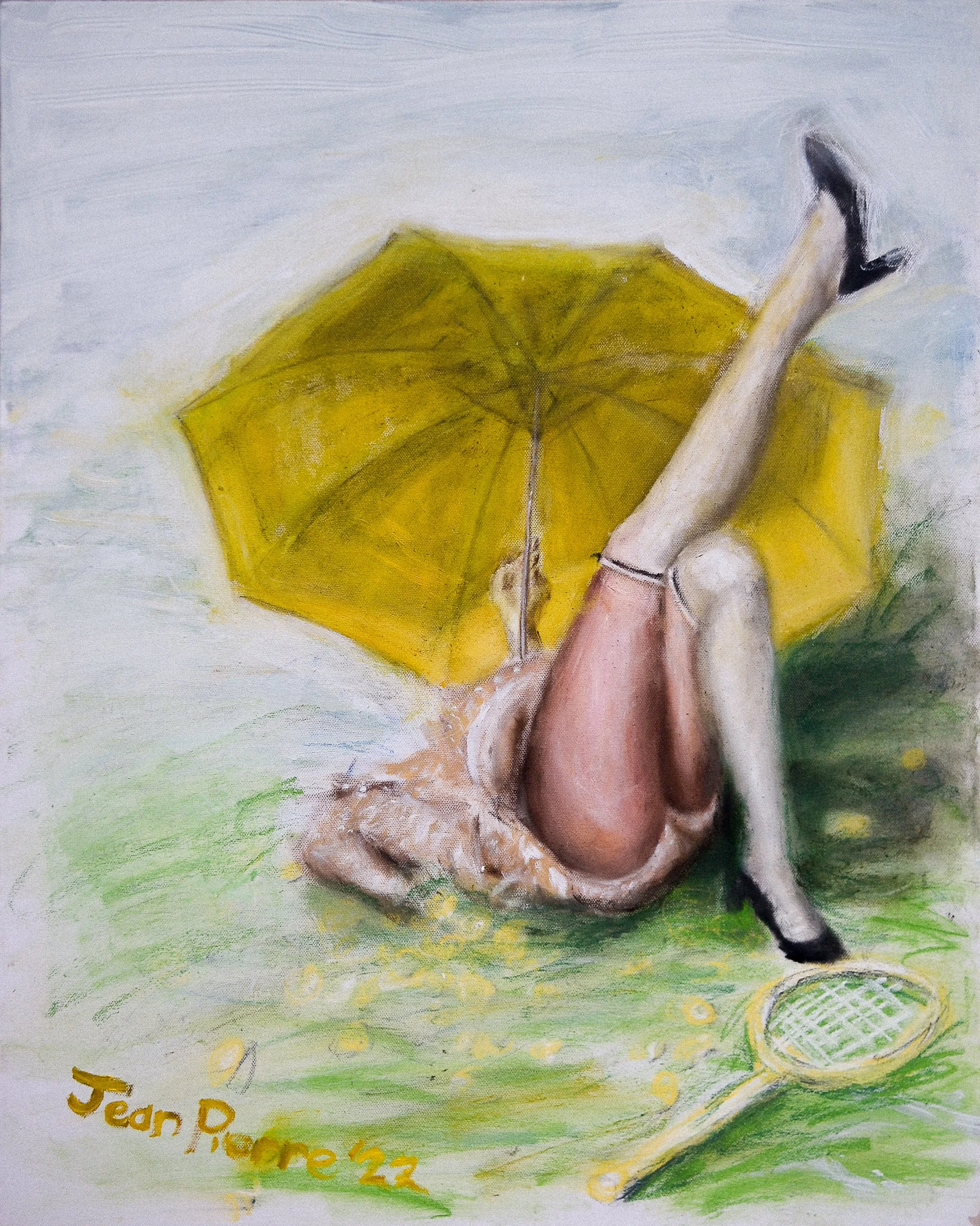 Jean Pierre's paintings take their inspiration from the work of photographers, geek culture, urban sports, and his own imagination. Although his work often has a dreamlike quality, his paintings often dwell on the very concrete beauty and potential of the human form. He is equally at home working with a muted and restricted palette, with deep shadows, the rich tones of skin, earth, and sea, or in bright, vivid colours; these last combine with moments of physical action and exuberance to give his series of paintings depicting skateboarders particular vibrance and joie de vivre.